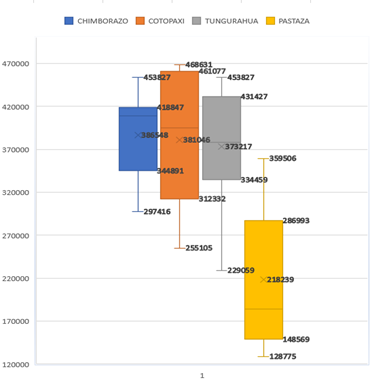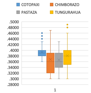 La figura 1 ofrece un análisis más detallado de la dispersión de los precios en estas cuatro provincias. El análisis estadístico del precio de la leche cruda al productor en las provincias de Cotopaxi, Tungurahua, Chimborazo y Pastaza revela diferencias significativas en los promedios, la dispersión y la estabilidad de los precios. Cotopaxi registra el precio promedio más alto (0,3935 USD), mientras que Pastaza presenta el promedio más bajo (0,3658 USD). Esto indica que Cotopaxi ofrece un mercado con precios más elevados en comparación con las demás provincias.