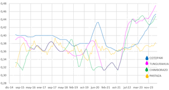 Chimborazo muestra la mayor variabilidad. Durante gran parte del período, los precios se sitúan entre 0,32 USD y 0,38 USD por litro, lo que indica una tendencia a precios más bajos en comparación con Cotopaxi y Tungurahua. A pesar de esto, también hay un incremento hacia 2023, aunque los precios se mantienen por debajo de los niveles observados en las otras provincias.