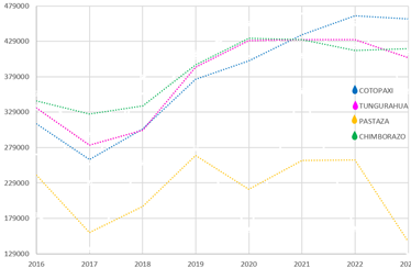 Cotopaxi: La producción de leche en Cotopaxi tuvo un comportamiento más constante en comparación con otras provincias. Desde 2015 hasta 2021, la producción se incrementó gradualmente, alcanzando su punto máximo en 2021 con alrededor de 400.000 litros. En 2022 y 2023, la producción se mantiene relativamente estable, con una pequeña disminución en el último año.