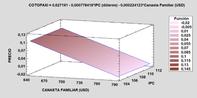 Precio (Cotopaxi)= 0,627191− 0,000778418 ⋅ IPC − 0,000224123 ⋅ Canasta Familiar
