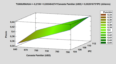 Precio (Tungurahua)= − 0,2199 + 0,000464274 ⋅ Canasta Familiar + 0,00261675 ⋅ IPC