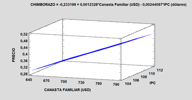 Precio (Chimborazo) = −0,233199 + 0,0012328 ⋅ Canasta Familiar − 0,002440097 ⋅ IPC
