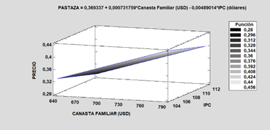 Los ejes principales de la figura 5 muestran el comportamiento del Precio (eje vertical) en función de dos variables independientes: el IPC (Índice de Precios al Consumidor) en el eje X y el costo de la Canasta Familiar en el eje Y. El modelo refleja cómo estos dos factores económicos afectan el precio de la leche. La ecuación de la regresión mostrada en la parte superior es: