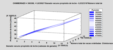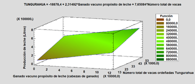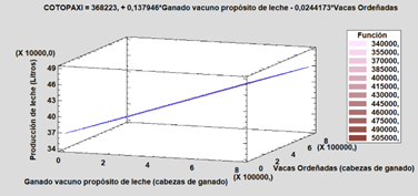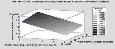 Producción (Pastaza) = 167831 – 0,02286 × Ganado vacuno propósito de leche + 3,05837 × Vacas ordeñadas |