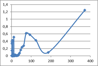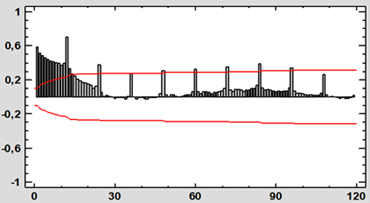 La función de autocorrelación de CAL (Fig. 2) muestra varias dinámicas. En primer lugar, los coeficientes disminuyen lentamente hasta el entorno del retardo 40 y luego comienzan de nuevo a incrementarse durante varios retardos. Por otro lado, son muy significativos los retardos estacionales (12, 24, 36…). En cuanto al Peridograma de CAL (Fig. 3) presenta su máxima ordenada en el último período (372) lo que demuestra la tendencia a largo plazo de la serie, y también presenta varios picos diferenciados que corresponden al período 12 y a los armónicos de 12 (6, 4, 3, 2.4 y 2) y que certifican la estacionalidad de la serie.