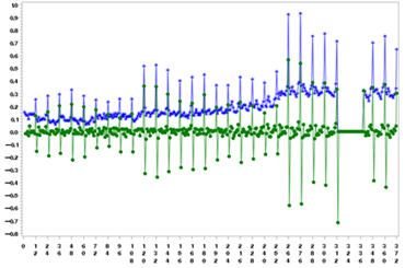 Las estimaciones del estadístico τ del test de Dickey-Fuller (DF) para la serie son inferiores en valor absoluto a los valores críticos para 1% y 5% para los dos modelos empleados. Por tanto, se confirma la presencia de raíz unitaria (tendencia) en CAL y la necesidad de tomar sus primeras diferencias para construir correctamente un modelo de predicción para dicha serie. En la Figura 4 se muestra la gráfica de D_CAL (Diferencias de CAL) comparándola con la de la serie original. En el punto siguiente se ahonda en los detalles y características de esta nueva serie que presenta una evolución estacionaria en media con ciclos no regulares en valor, pero sí en frecuencia.