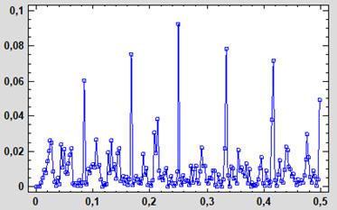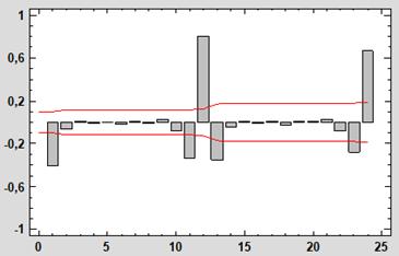 Después de ver y estudiar la gráfica de D_CAL en el punto anterior se pasa al estudio de la función de autocorrelación y del Peridograma de esta nueva función para asegurar que es adecuado para construir el modelo. La función de autocorrelación de la Figura 5 muestra unos coeficientes significativos en los retardos estacionales (12, 24…) y también unos coeficientes relevantes justamente anteriores y posteriores a los estacionales (1, 11, 13, 23…). Por su parte el Peridograma (del que se hablará también en el punto siguiente) presenta su ordenada máxima en el período 3 y ordenadas significativas en 12 y en el resto de sus armónicos, lo que denota su estacionalidad.