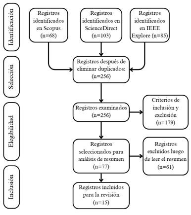 Se realizó una búsqueda en distintos motores de base de datos, y ello derivó en un total de 256 publicaciones divididas en las siguientes fuentes: Scopus(68), ScienceDirect (103), IEEE Explore (85).