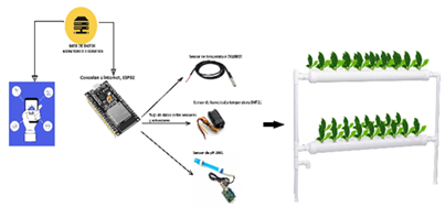 El sistema también permite el almacenamiento de datos en una tarjeta microSD, estos datos son analizados para determinar los volúmenes utilizados en los 35 días que dura la cosecha de la lechuga crespo, para la recirculación de la solución nutritiva en los tubos PVC, también se utiliza un control ON-OFF que se acciona una vez cada hora durante 15 min, esto con el fin de que las plantas reciban todos los nutrientes para su correcto desarrollo, en la Figura 2 se muestra el esquema del diseño propuesto.