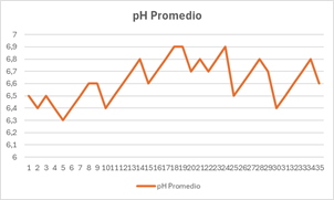 La automatización de la dosificación de nutrientes ha reducido el desperdicio de solución nutritiva y agua, además ha permitido mantener las condiciones del cultivo estable. Durante los 35 días se observó una dosificación efectiva de los nutrientes N, P, K y agua a lo largo del ciclo de cultivo, garantizando de esta manera las condiciones idóneas y disponibilidad de la solución rica en nutrientes en el reservorio para el crecimiento de las plantas. Además, el sistema de control ON-OFF alojado en el microcontrolador Arduino MEGA optimizó la dosificación en base a las necesidades detectados, lo que permitió reducir la posibilidad de una sobrealimentación al activar el suministro de solución nutritiva. En la Figura 3 se muestra el comportamiento del pH durante el ciclo del cultivo, donde se observa que el valor máximo alcanzado es de 6,9 y el mínimo es de 6,3.