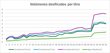 Figura 4. Comportamiento de volúmenes dosificados N, P, K y agua.