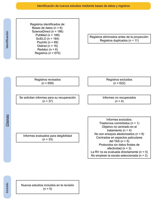Se realizó una revisión sistemática con el propósito de analizar la efectividad de la RV en el tratamiento de TAS, para ello se siguieron las pautas de la metodología PRISMA (Page et al., 2021)