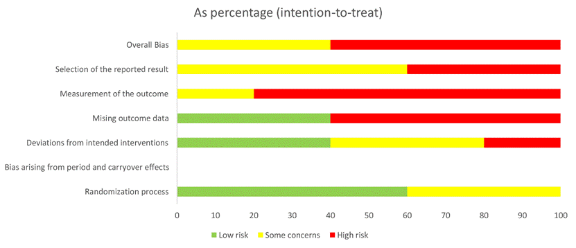 Se identificó un riesgo de sesgo en la aleatorización de los grupos moderados a altos en los estudios incluidos. En concreto, el 40 % de los artículos presentaron riesgo moderado, mientras que el 60 % mostraron un riesgo alto.